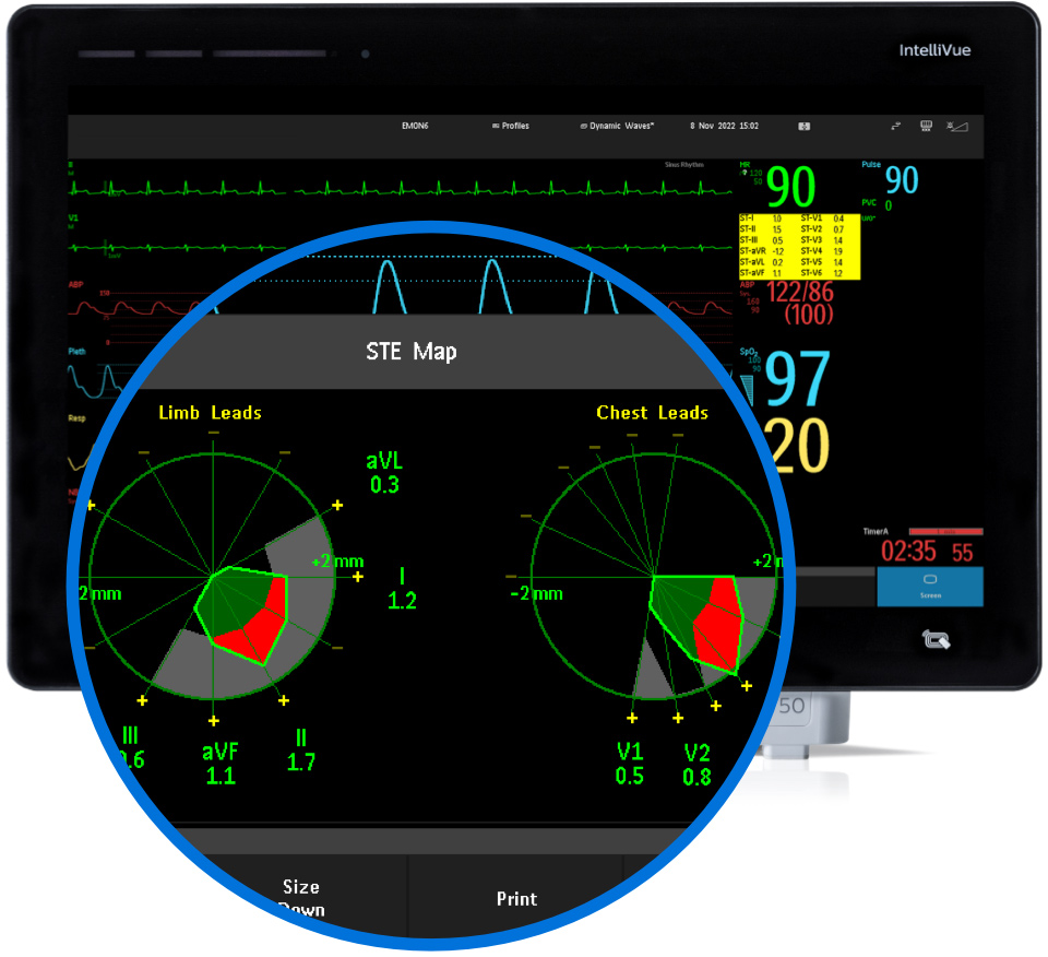 ST Map collects ST values and trends from all measured chest and limb leads. It provides the patient’s ST values in a multi-axis diagram that allows clinicians to quickly see ST changes and their location in the heart.